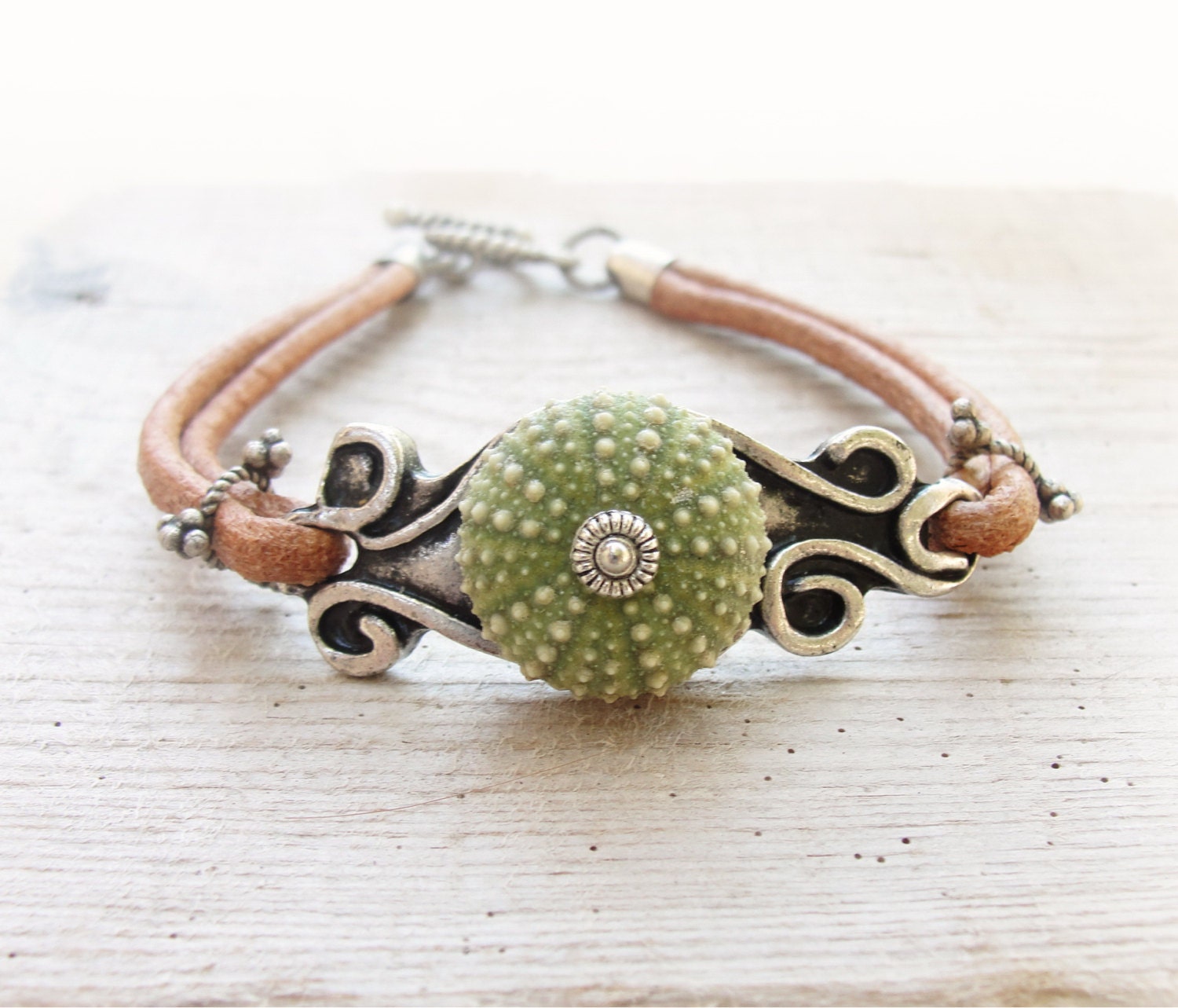 Leather Sea Urchin Bracelet Green and Salmon hues