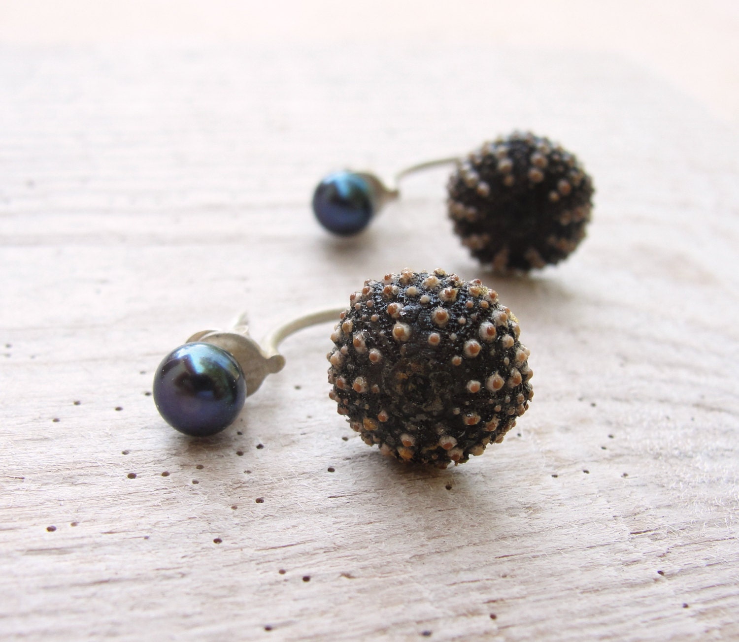 Brown Sterling silver Sea urchin Earrings with Pearls