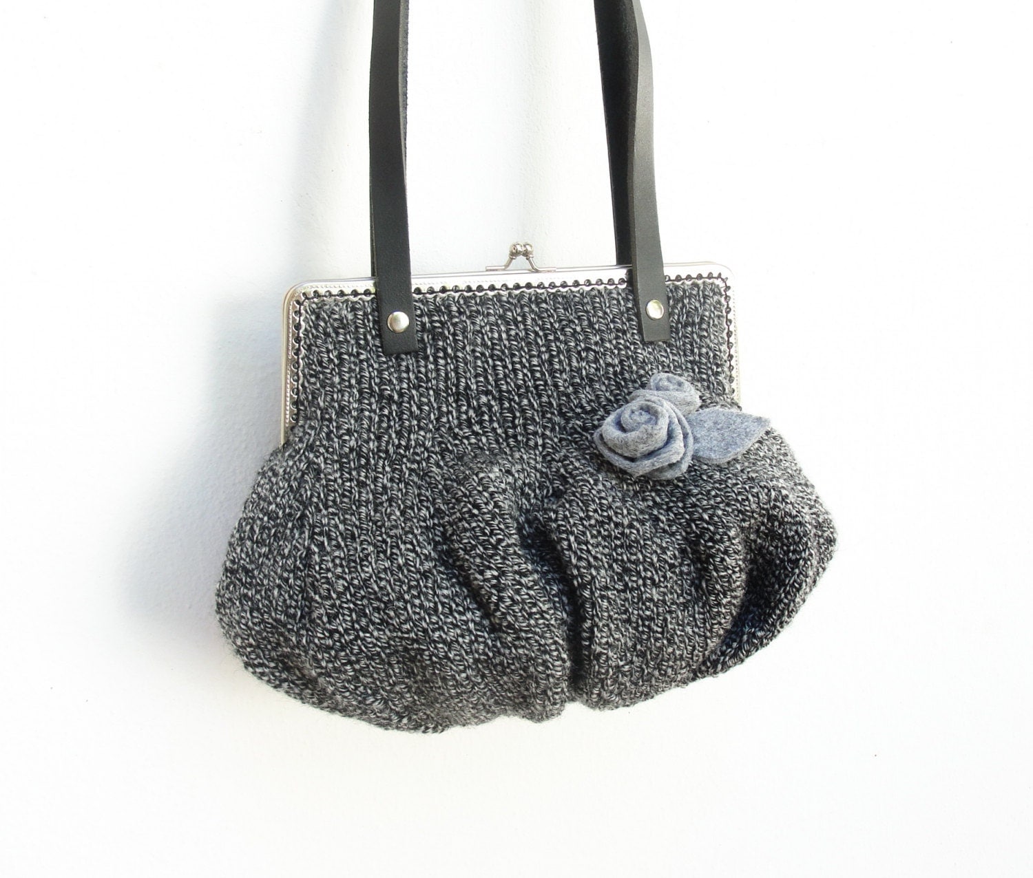 Black Grey Pouch Clutch Hand knitted with Felt Roses